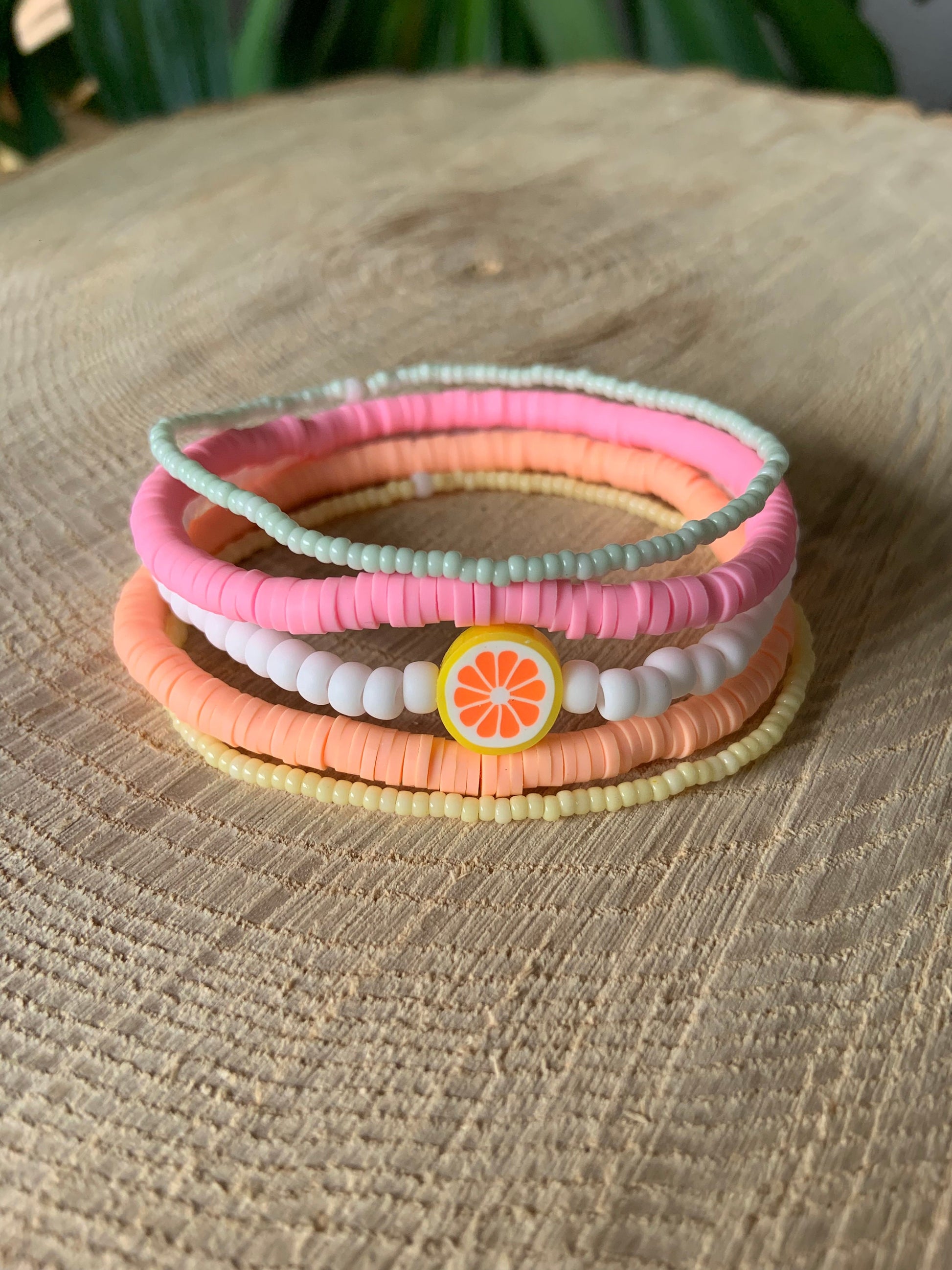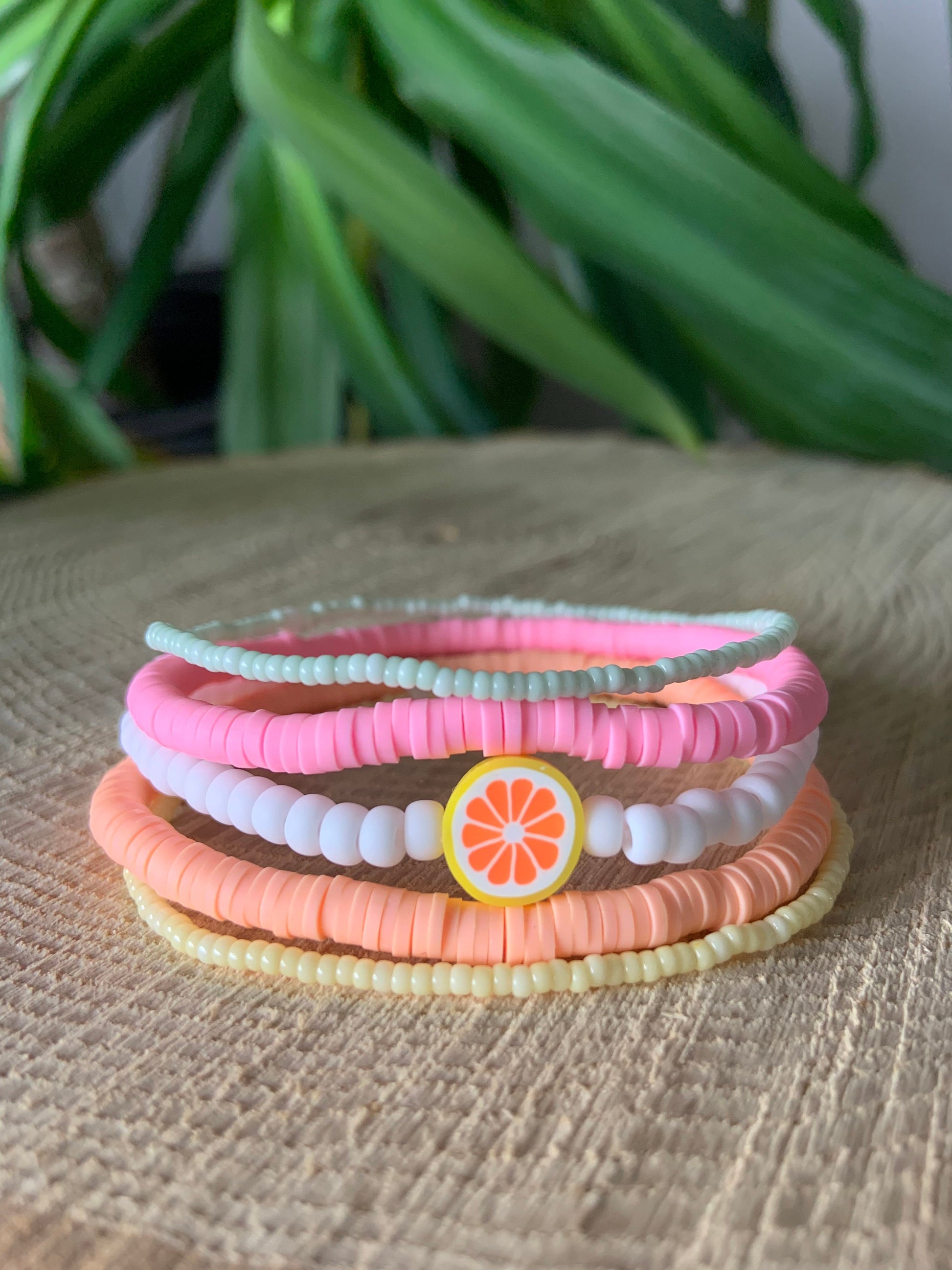 Stack of 5 beaded bracelets, 3 seed bead (with fruit bead) and 2 4mm polymer clay bead.