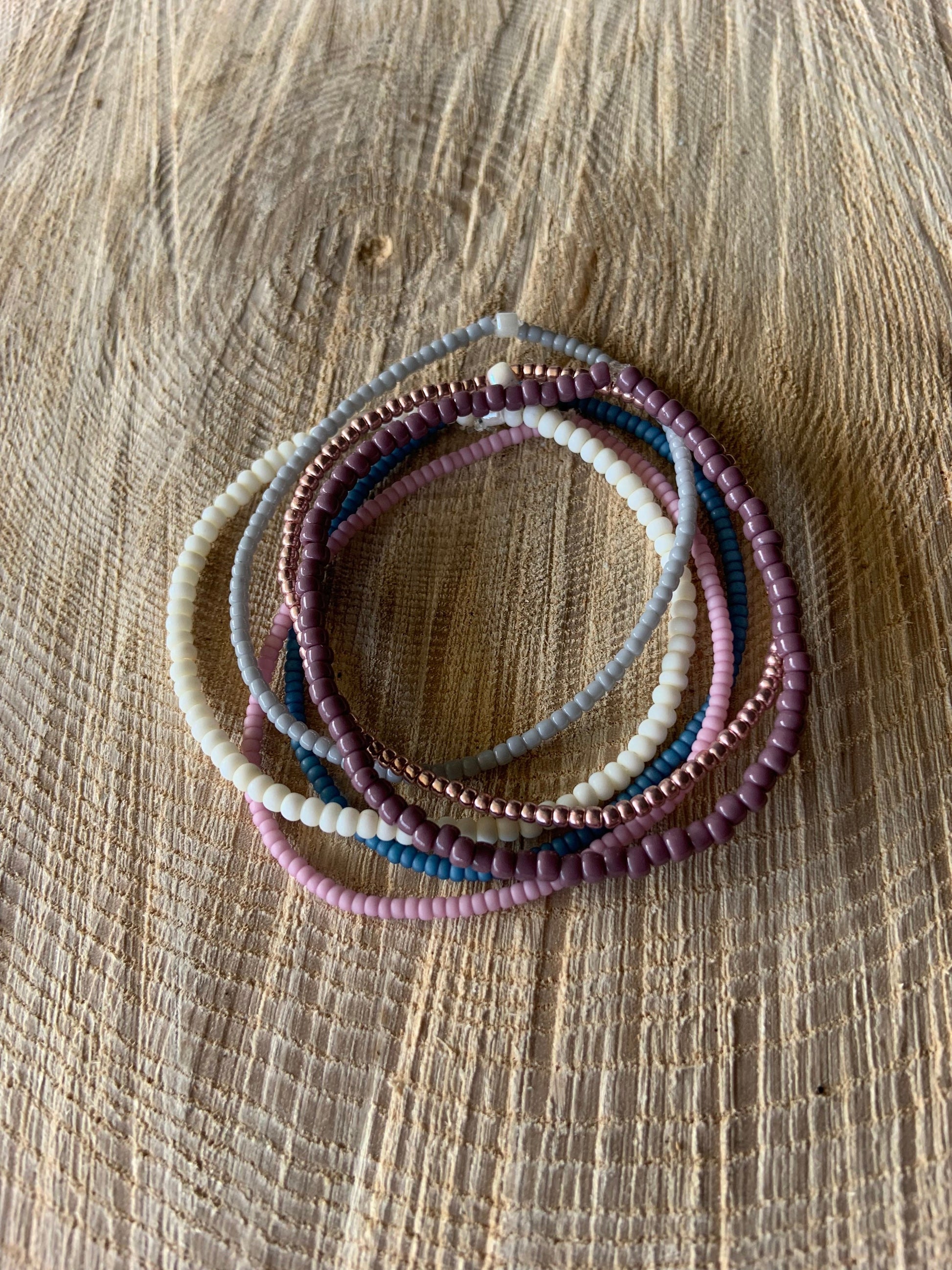 Stack of 6 seed/macaroon bead bracelets. Colours include soft purple, pink and grey with a pop of rose gold.